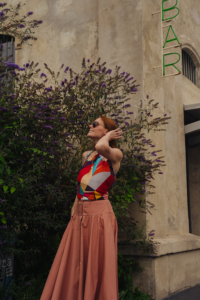 Miss USA 2011 Alyssa Campanella of The A List blog shares her daytime outfit in Milan, Italy on August 4, 2023 at Bar Luce