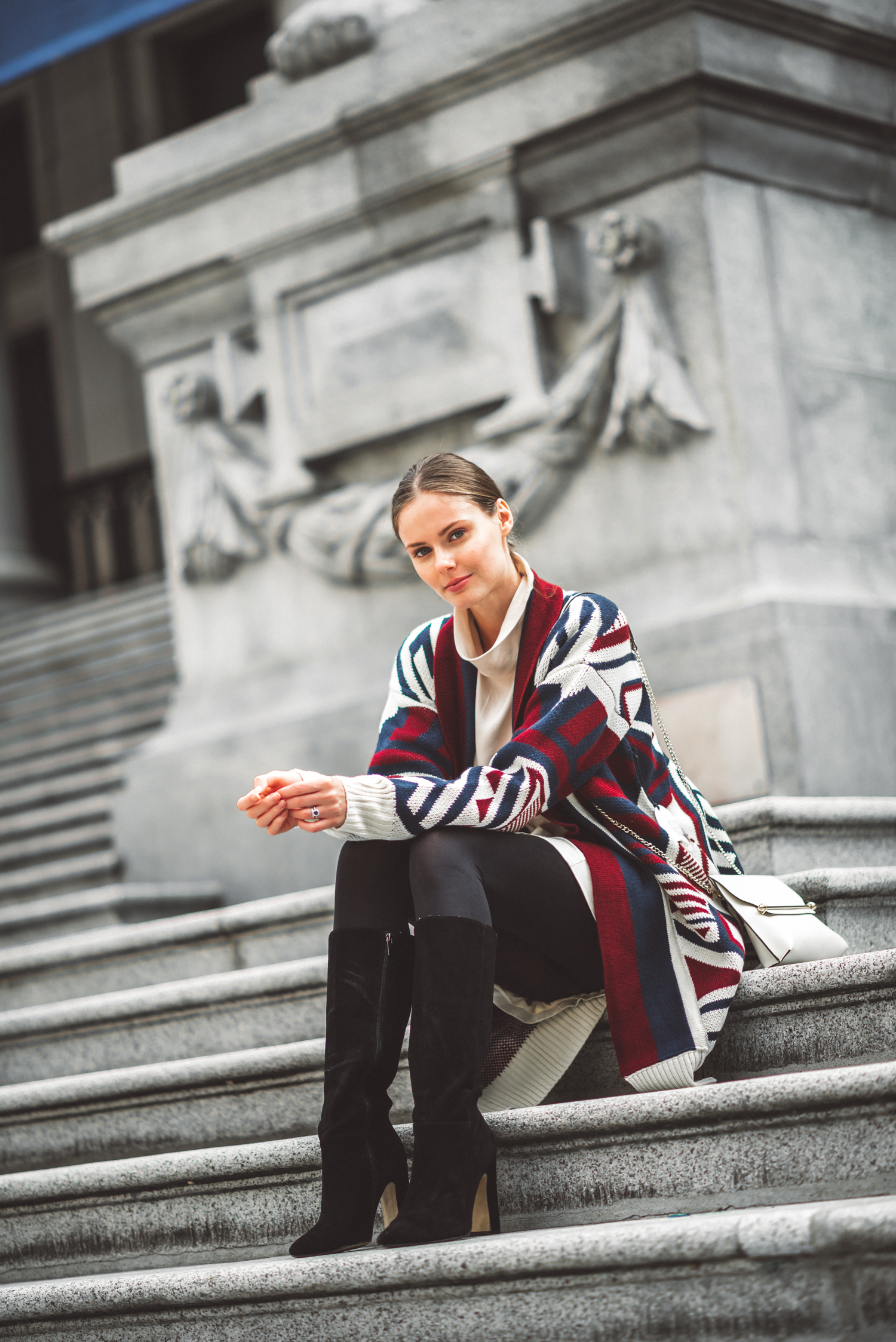 Alyssa Campanella of The A List blog shares the best in sweater coats wearing Tularosa Page sweater, Raye Maple boots, and Strathberry East West stylist bag.