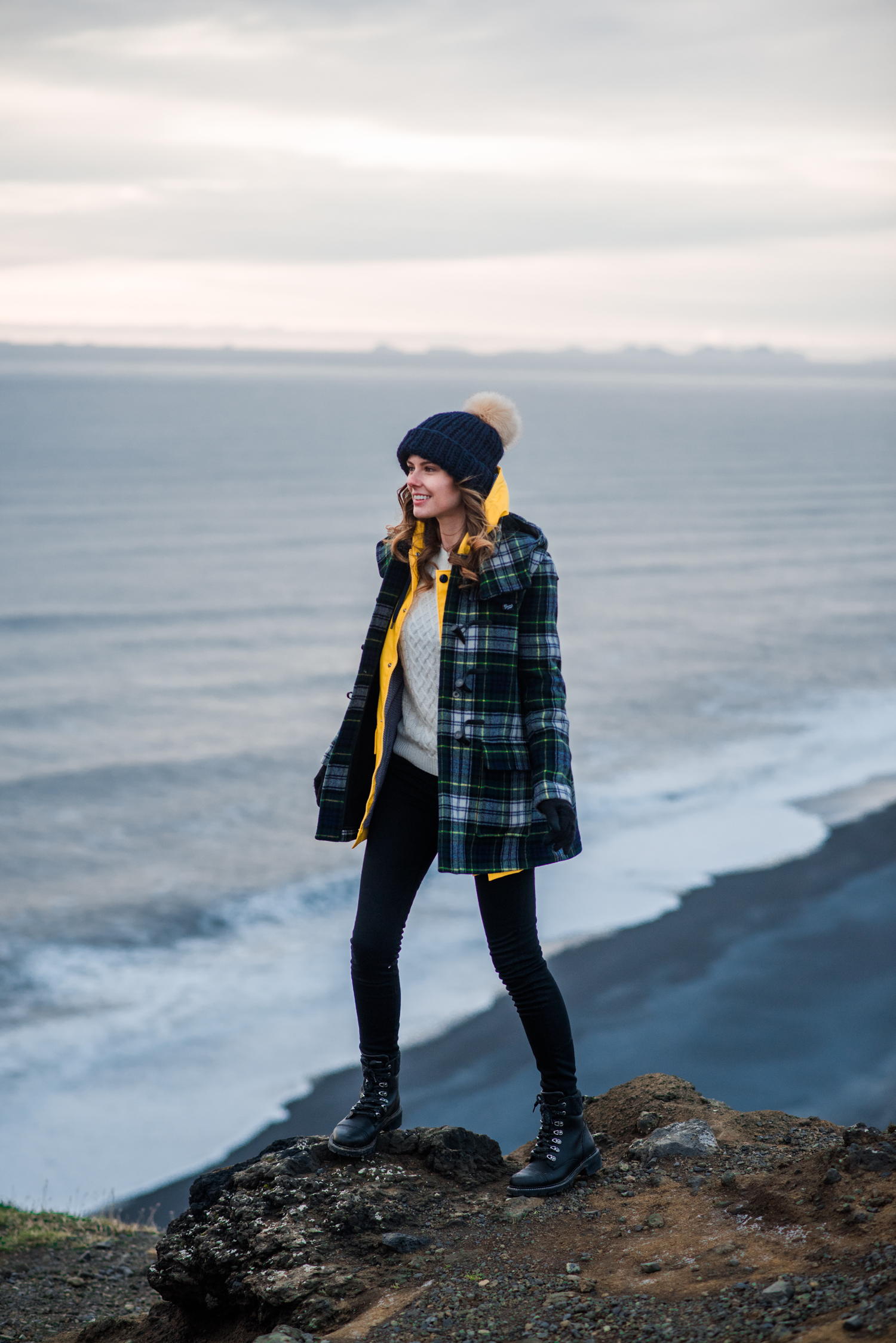 Alyssa Campanella of The A List blog wearing Gloverall plaid coat at Dyrhólaey on a road trip from Akureyri to Vik, Iceland