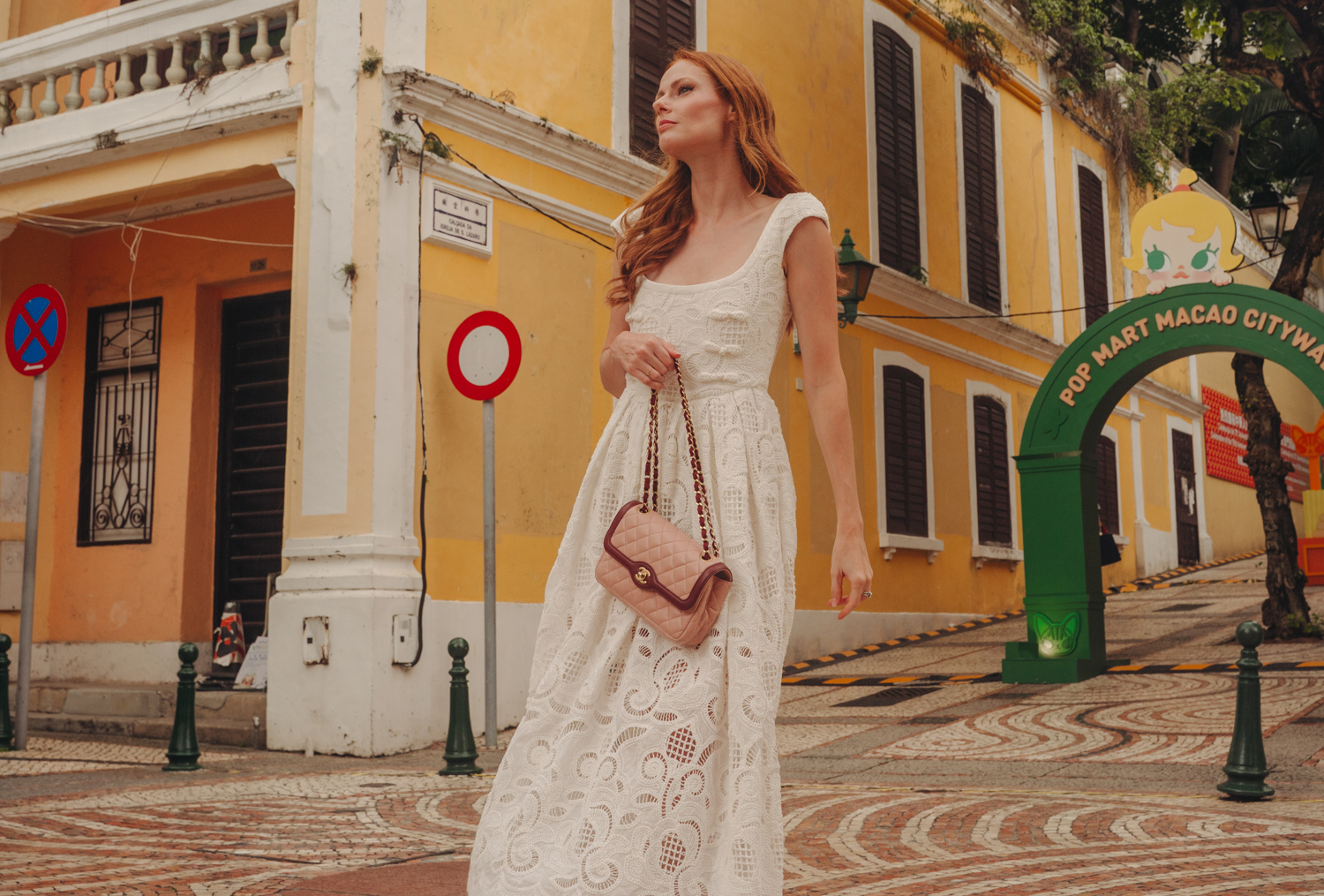 Miss USA 20111 Alyssa Campanella of the A List blog visits St. Lazarus Quarter in Macau wearing San Lee.
