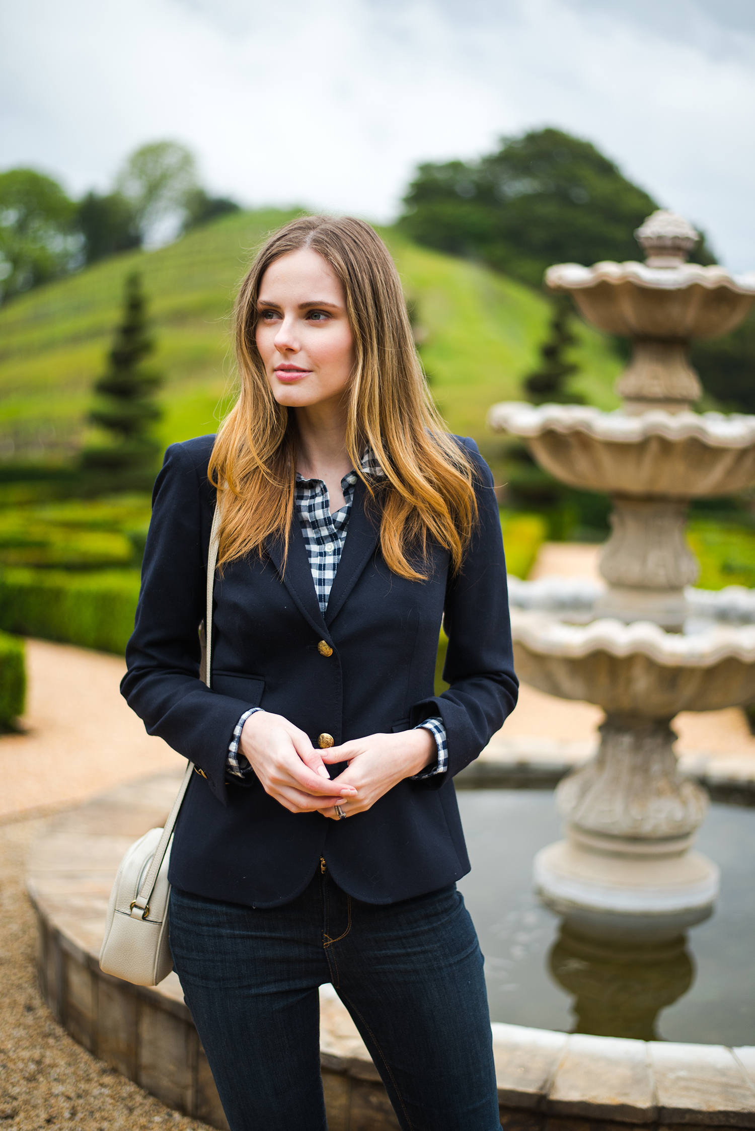 Miss USA 2011 Alyssa Campanella of The A List blog visits Newton Vineyards in Napa, California wearing J. Crew Schoolboy blazer and Frye Dorado Boots